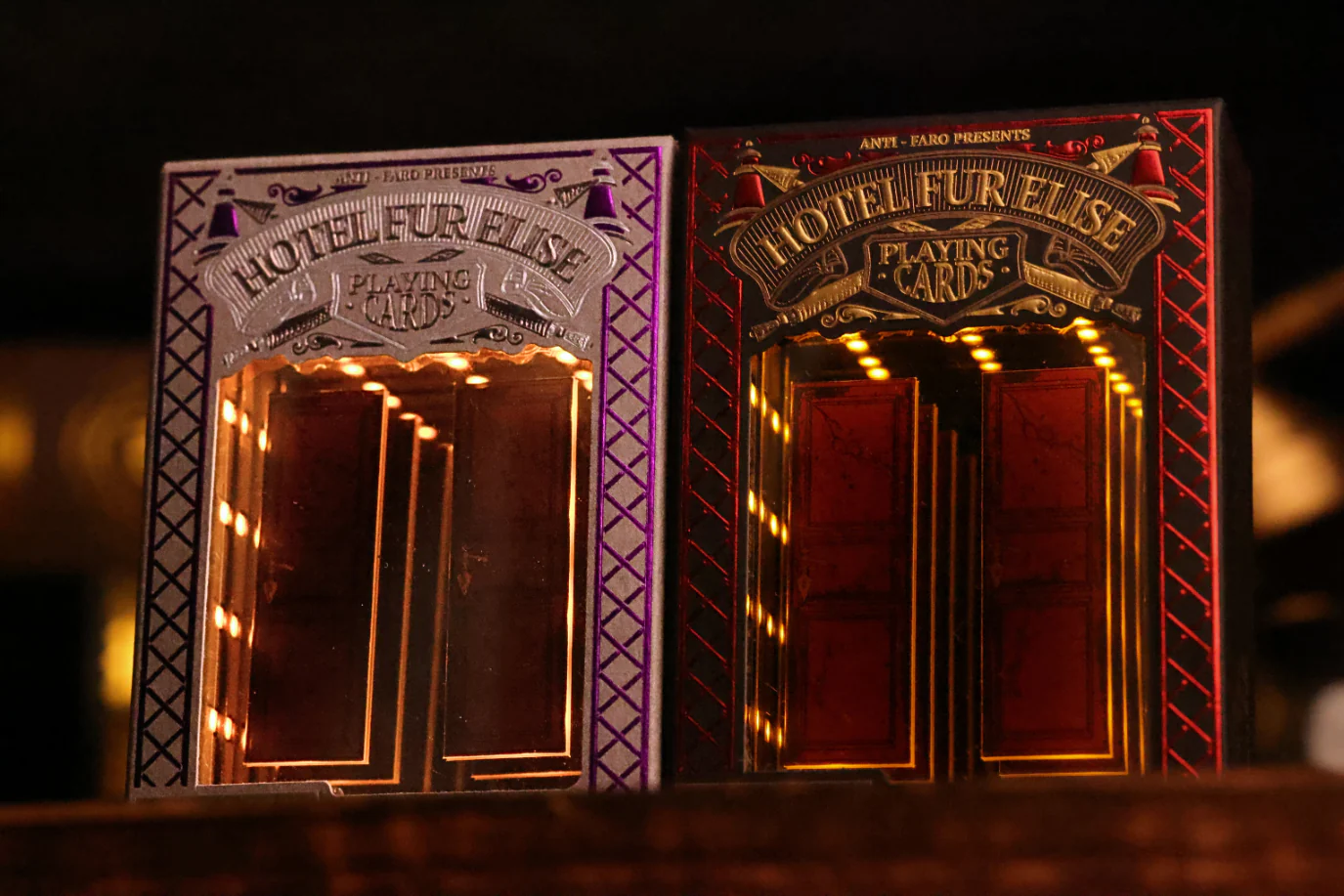 This Collector’s Set includes all four editions from The Hotel Fur Elise Playing Cards series. Sealed in a Half-brick box for 6 decks, along with an oversized Vintage Hotel Door "Door Key" Keychain.